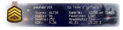 | Headshots | 23 | Suicides | 2 | Headshot / Kill | 25.27 % |