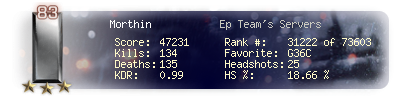 | Headshots | 25 | Suicides | 3 | Headshot / Kill | 18.66 % |