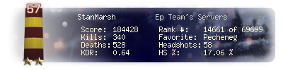 | Headshots | 58 | Suicides | 3 | Headshot / Kill | 17.06 % |