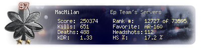 | Headshots | 29 | Suicides | 2 | Headshot / Kill | 9.42 % |