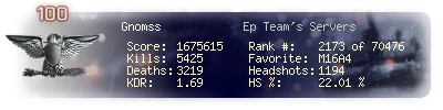 | Headshots | 1194 | Suicides | 32 | Headshot / Kill | 22.01 % |