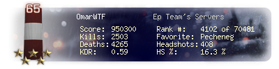 | Headshots | 408 | Suicides | 40 | Headshot / Kill | 16.3 % |