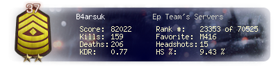 | Headshots | 15 | Suicides | 4 | Headshot / Kill | 9.43 % |