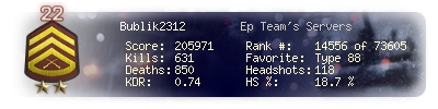 | Headshots | 118 | Suicides | 42 | Headshot / Kill | 18.7 % |