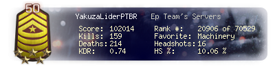 | Headshots | 16 | Suicides | 14 | Headshot / Kill | 10.06 % |