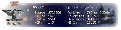| Kills | 14732 | Deaths | 9541 | Kill / Death | 1.54 |