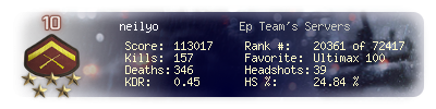 | Headshots | 36 | Suicides | 10 | Headshot / Kill | 24.66 % |