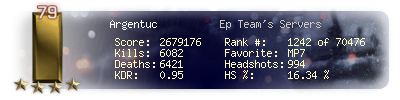 | Headshots | 994 | Suicides | 120 | Headshot / Kill | 16.34 % |