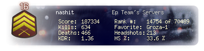 | Headshots | 213 | Suicides | 0 | Headshot / Kill | 33.6 % |