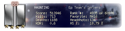 | Headshots | 134 | Suicides | 14 | Headshot / Kill | 18.79 % |
