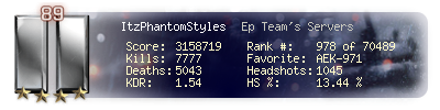 | Headshots | 1045 | Suicides | 45 | Headshot / Kill | 13.44 % |