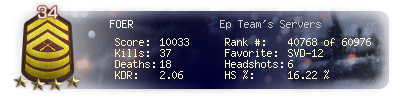 | Headshots | 6 | Suicides | 0 | Headshot / Kill | 16.22 % |