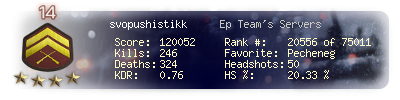 | Kill-streak | 7 | Death-streak | 13 | Team Kills | 0 |
