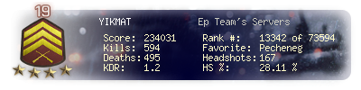 | Headshots | 167 | Suicides | 4 | Headshot / Kill | 28.11 % |