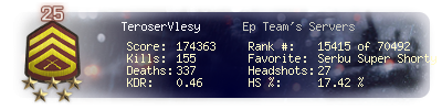 | Headshots | 242 | Suicides | 15 | Headshot / Kill | 17.69 % |