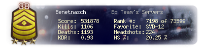| Headshots | 219 | Suicides | 8 | Headshot / Kill | 20.28 % |