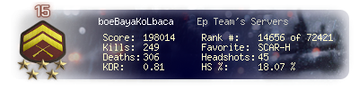 | Headshots | 45 | Suicides | 4 | Headshot / Kill | 18.07 % |