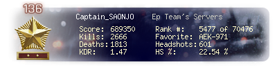 | Kills | 2666 | Deaths | 1813 | Kill / Death | 1.47 |
