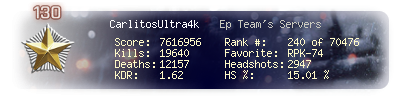 | Kills | 19640 | Deaths | 12157 | Kill / Death | 1.62 |