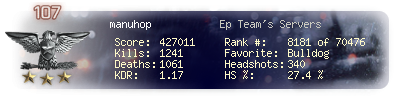 | Headshots | 76 | Suicides | 8 | Headshot / Kill | 29.92 % |