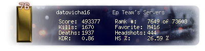 | Headshots | 444 | Suicides | 13 | Headshot / Kill | 26.59 % |