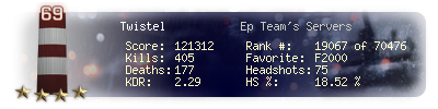 | Headshots | 75 | Suicides | 0 | Headshot / Kill | 18.52 % |