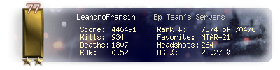 | Headshots | 264 | Suicides | 27 | Headshot / Kill | 28.27 % |