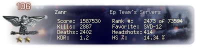 | Kills | 2887 | Deaths | 2402 | Kill / Death | 1.2 |