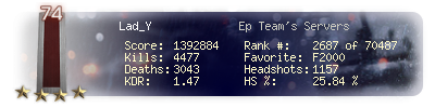 | Headshots | 1157 | Suicides | 8 | Headshot / Kill | 25.84 % |
