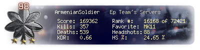 | Headshots | 88 | Suicides | 2 | Headshot / Kill | 24.65 % |