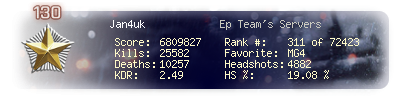 | Headshots | 4882 | Suicides | 56 | Headshot / Kill | 19.08 % |