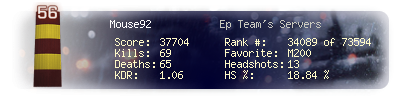 | Headshots | 13 | Suicides | 1 | Headshot / Kill | 18.84 % |