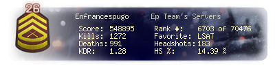 | Headshots | 161 | Suicides | 8 | Headshot / Kill | 14.53 % |