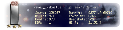 | Headshots | 209 | Suicides | 14 | Headshot / Kill | 21.52 % |