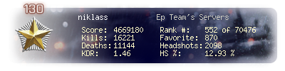 | Headshots | 2098 | Suicides | 82 | Headshot / Kill | 12.93 % |