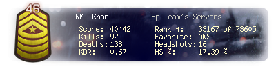 | Headshots | 16 | Suicides | 2 | Headshot / Kill | 17.39 % |