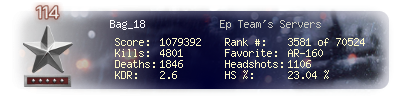 | Headshots | 1106 | Suicides | 16 | Headshot / Kill | 23.04 % |