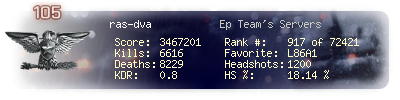 | Headshots | 1200 | Suicides | 41 | Headshot / Kill | 18.14 % |