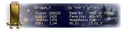 | Headshots | 150 | Suicides | 8 | Headshot / Kill | 12.3 % |