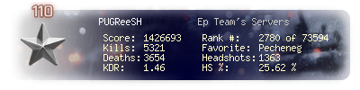 | Headshots | 110 | Suicides | 13 | Headshot / Kill | 16.69 % |