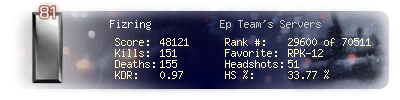 | Headshots | 51 | Suicides | 1 | Headshot / Kill | 33.77 % |