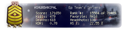 | Headshots | 108 | Suicides | 6 | Headshot / Kill | 22.55 % |