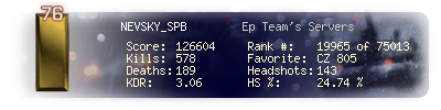 | Headshots | 143 | Suicides | 0 | Headshot / Kill | 24.74 % |