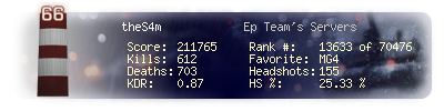 | Headshots | 155 | Suicides | 11 | Headshot / Kill | 25.33 % |