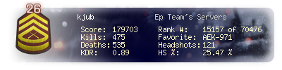 | Headshots | 121 | Suicides | 7 | Headshot / Kill | 25.47 % |