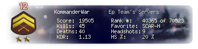 | Headshots | 9 | Suicides | 0 | Headshot / Kill | 20 % |