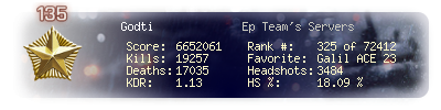 | Headshots | 3484 | Suicides | 96 | Headshot / Kill | 18.09 % |