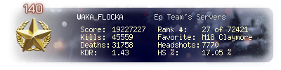 | Headshots | 7770 | Suicides | 662 | Headshot / Kill | 17.05 % |