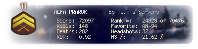 | Headshots | 32 | Suicides | 4 | Headshot / Kill | 21.62 % |