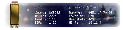 | Headshots | 96 | Suicides | 3 | Headshot / Kill | 13.81 % |